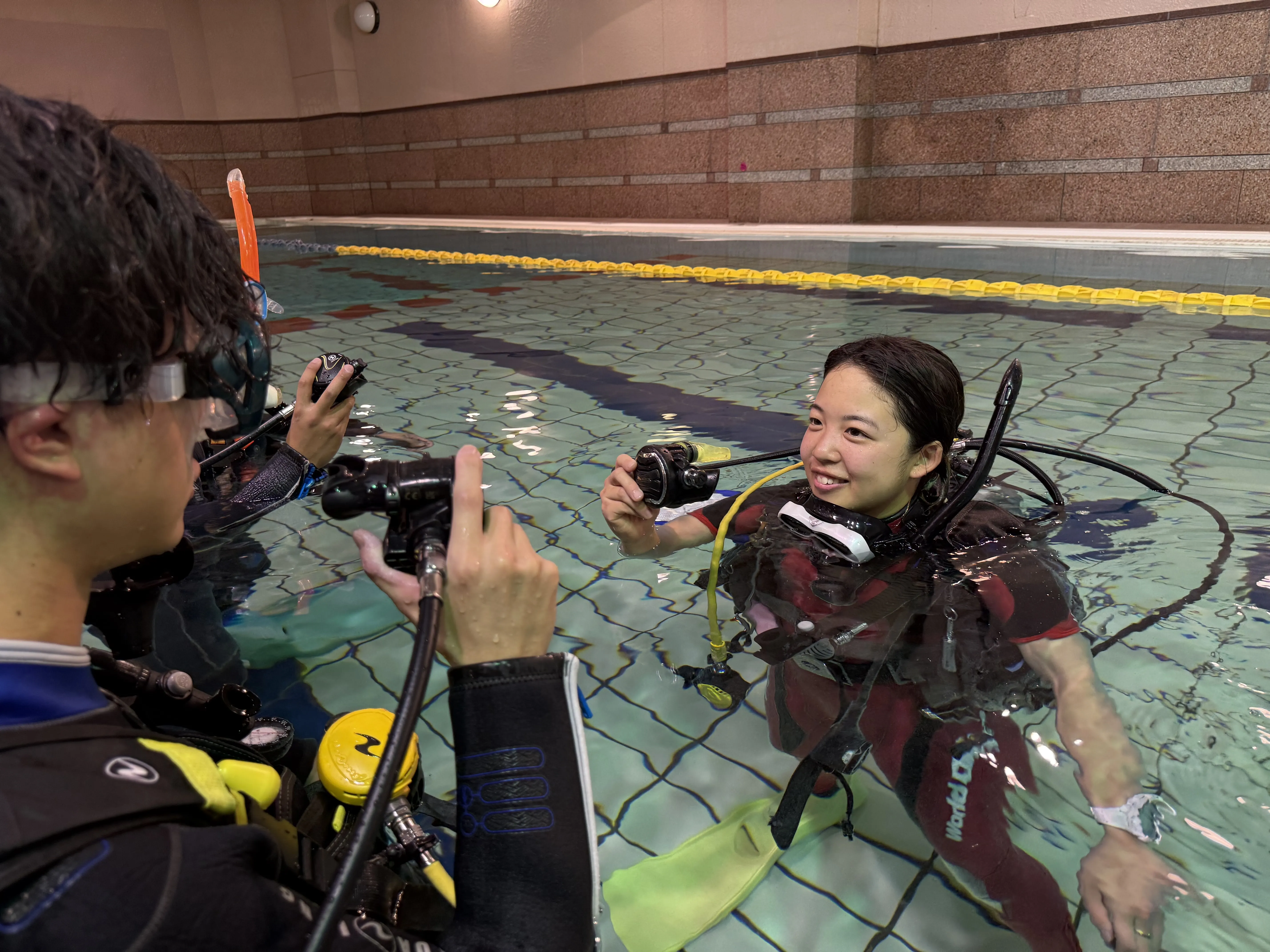 自社の大型ダイビングスクールでじっくり感覚をつかんでいきます。追加講習も無料なので、心配な方は納得いくまで練習することができます。