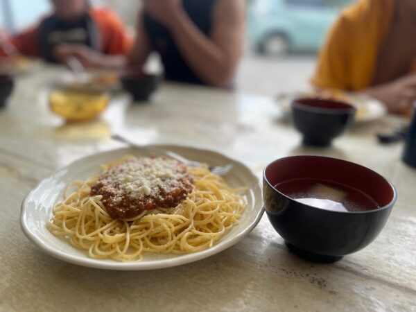 一度サービスへ戻りお昼ご飯♪ みんなでミートソーススパゲッティを食べて、いざ2本目へ!