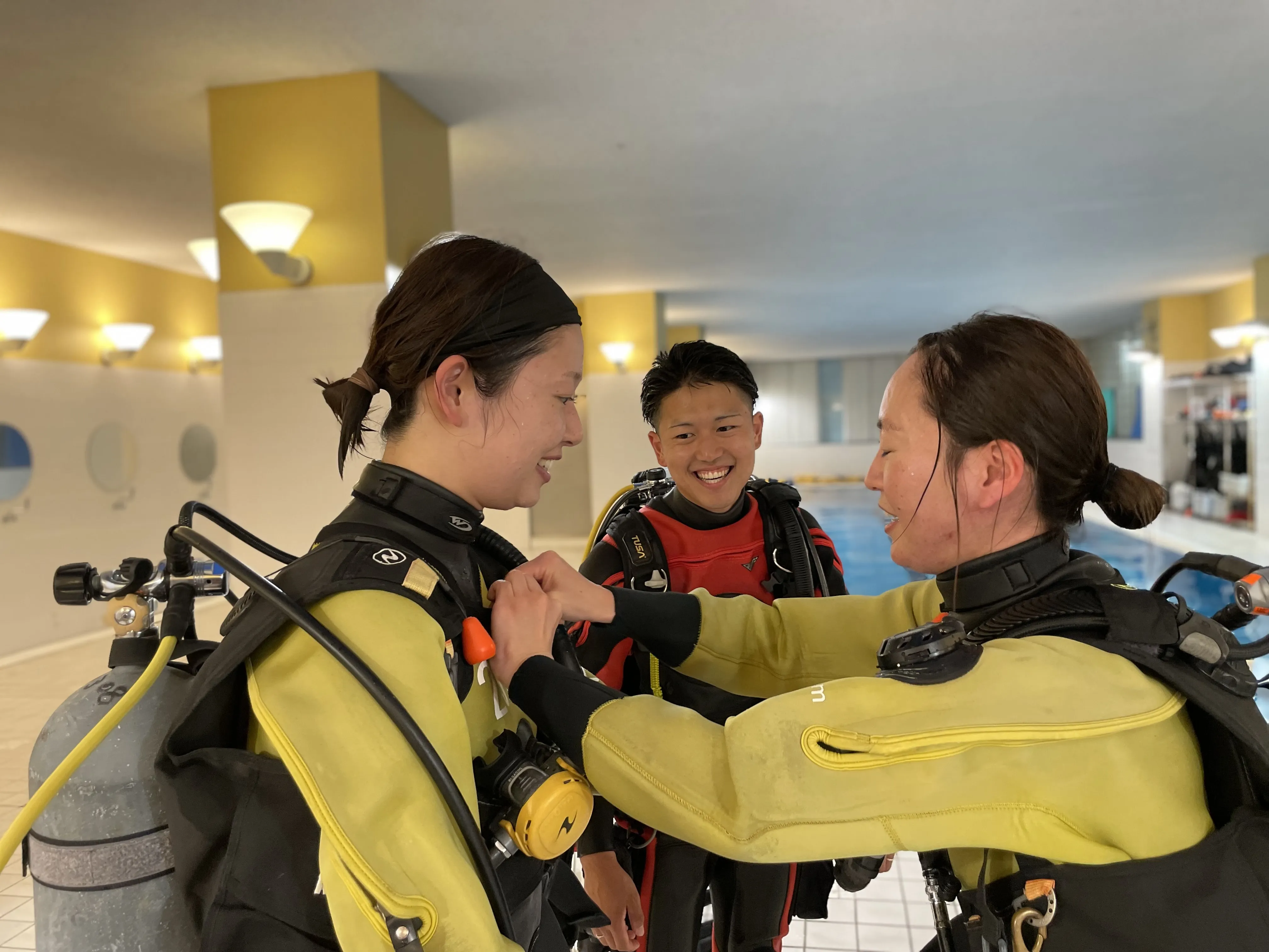自社の大型ダイビングスクールでじっくり感覚をつかんでいきます。追加講習も無料なので、心配な方は納得いくまで練習することができます。