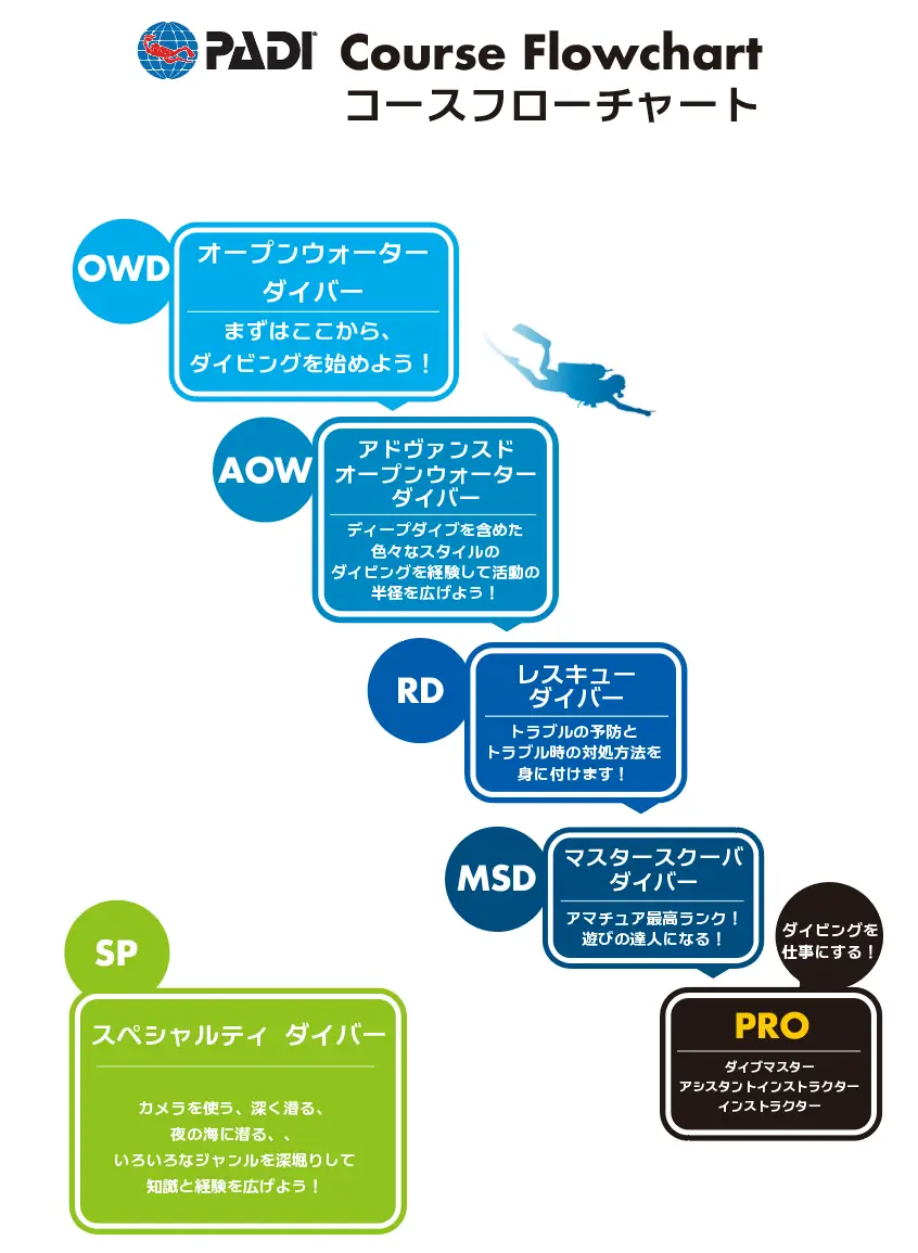 ダイビングスクールマレアでは、指導団体PADIの様々なステップアップコースの受講が可能です。