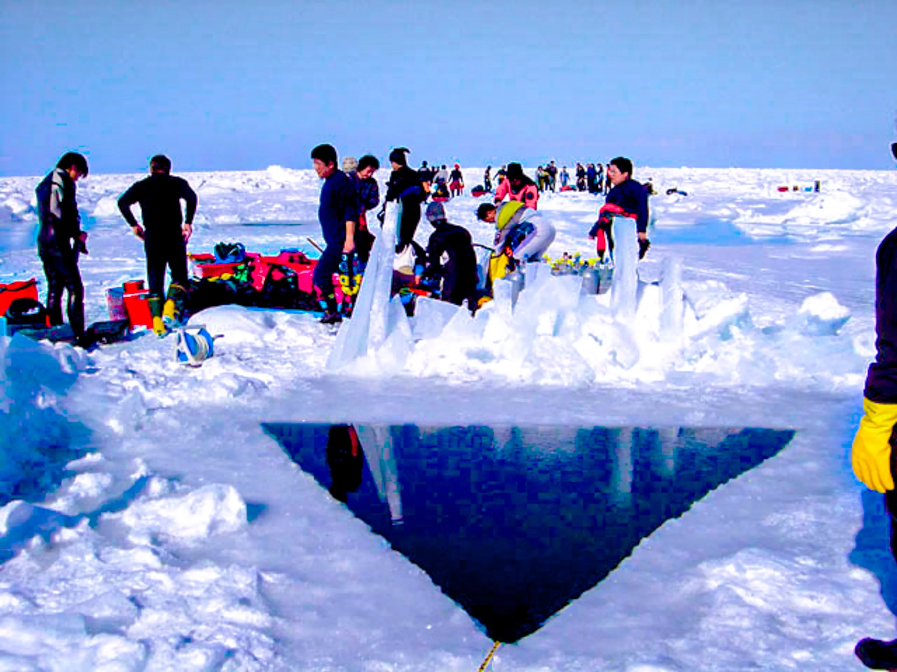 その流氷の下を潜るダイビング!流氷にチェーンソーに三角穴を開けてEN、EX場所を作ります。