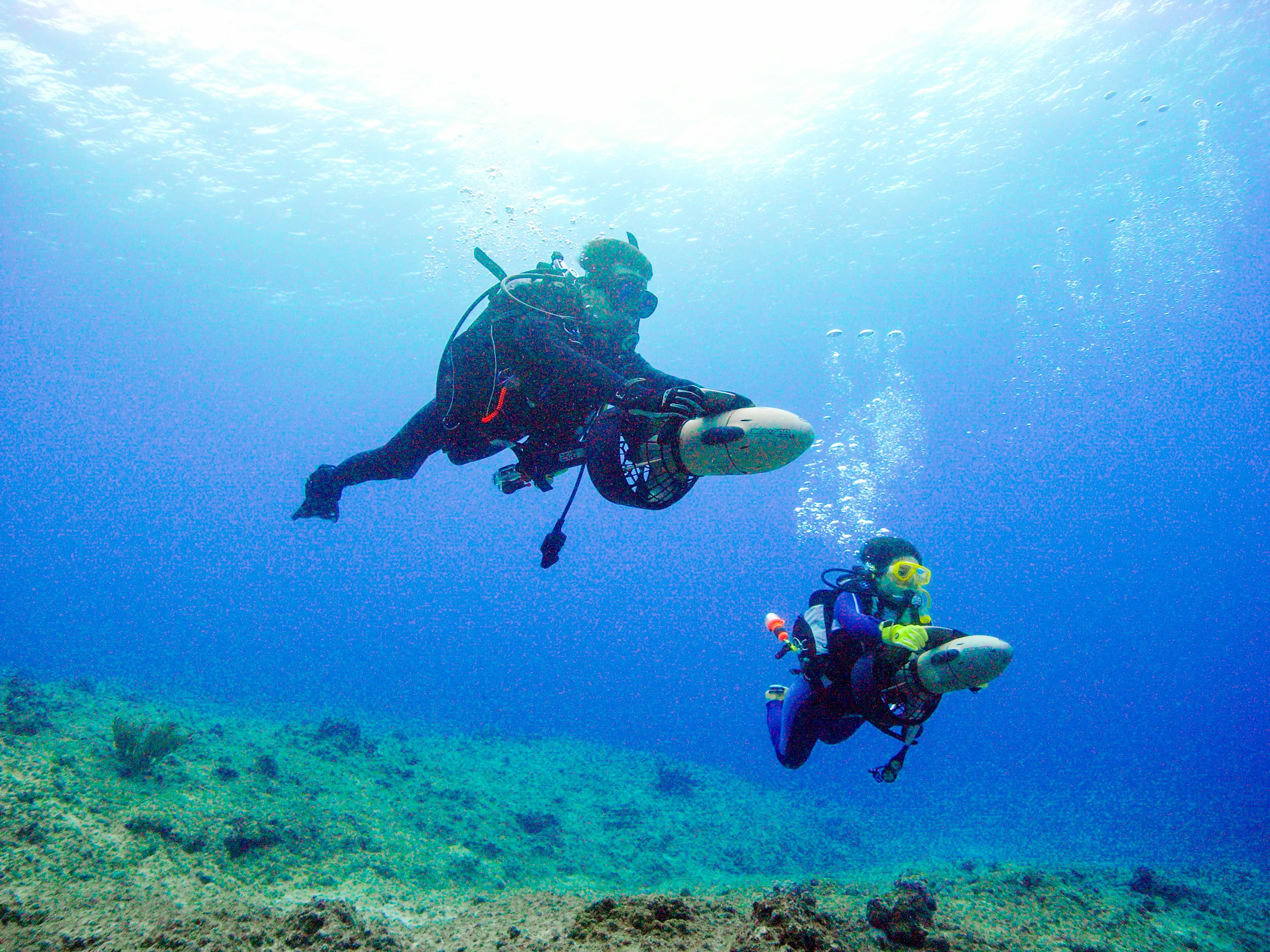 つかまっているだけで水中を自由自在に移動できる水中スクーター。
