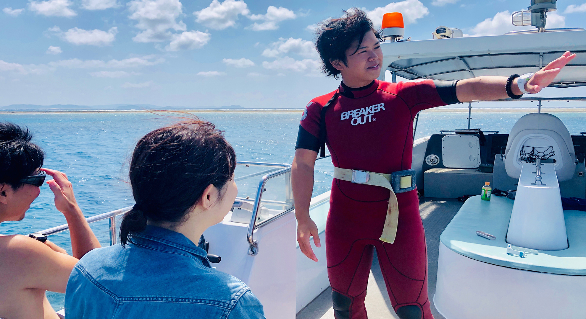 チーフインストラクターとしてFUNダイビングやライセンス講習、船の手配に予約の管理とダイビングに関わる業務は、全て担当し沖縄本島ならではのダイビングをリクエストやランクに合わせ、船を手配しています。