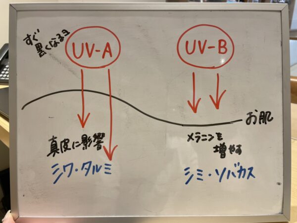 UV-A・・・お肌をすぐに黒くさせる紫外線になっています。こちらの対策としてPAがあります。よく「PA+」~「PA++++」が書かれていると思います。「+」の数が多いほどUV-Aの防止力が高くなっています。