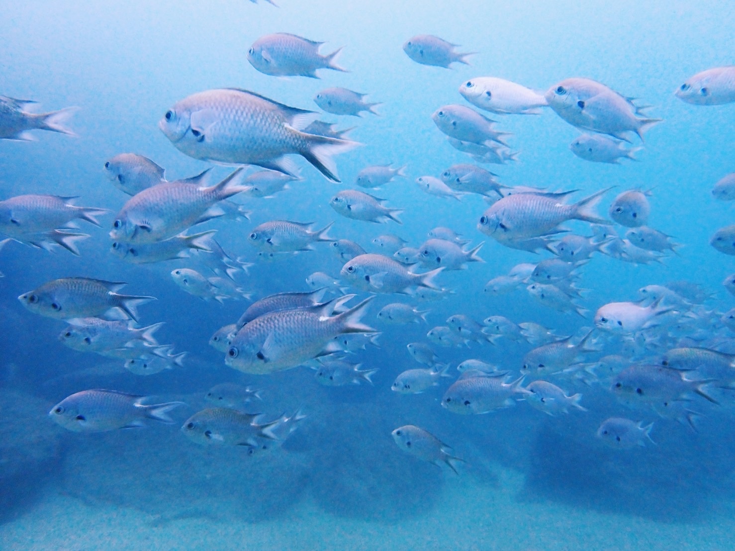 白い砂地を泳ぐソラスズメダイの群れ、イソギンチャクに隠れるクマノミなど被写体探しでも楽しめます。