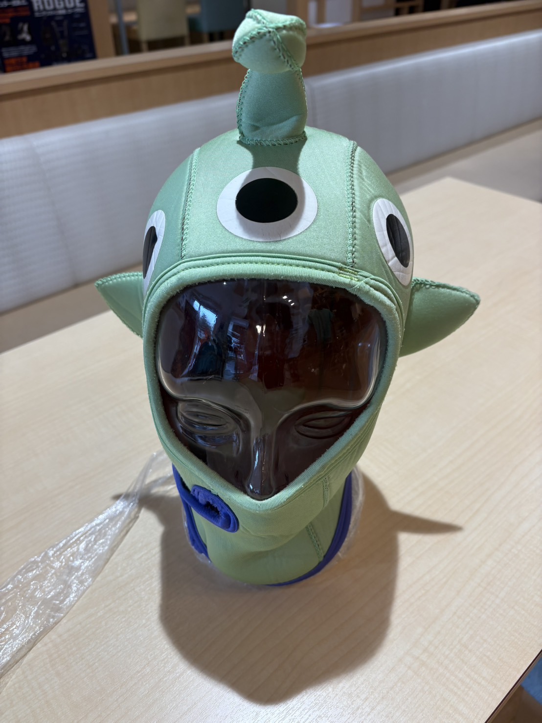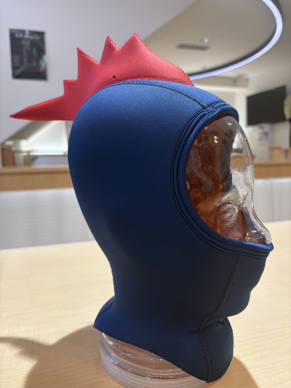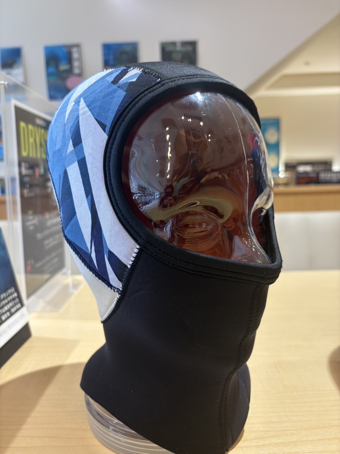 先ほどのフードよりも少し首周りのゴムが伸びやすく柔らかいため着る時や脱ぐ時、また水中での締めつけ等は少し抑えられます!