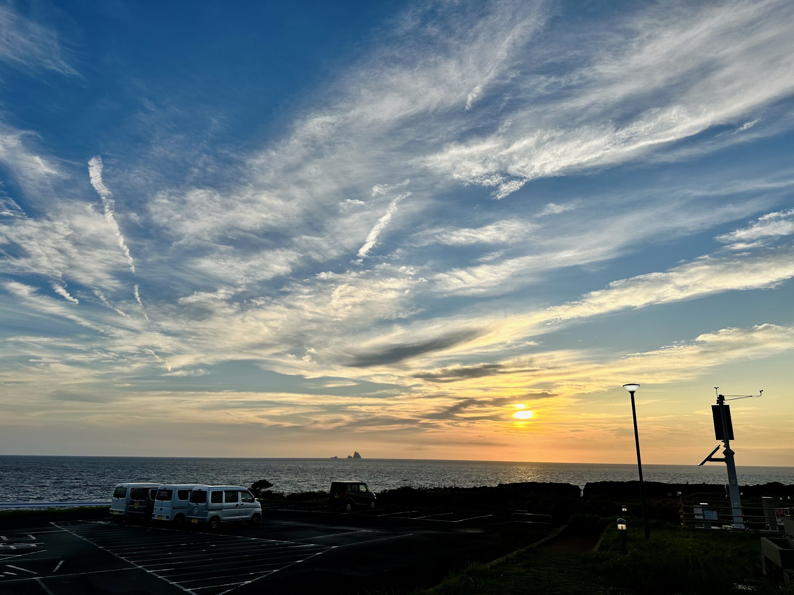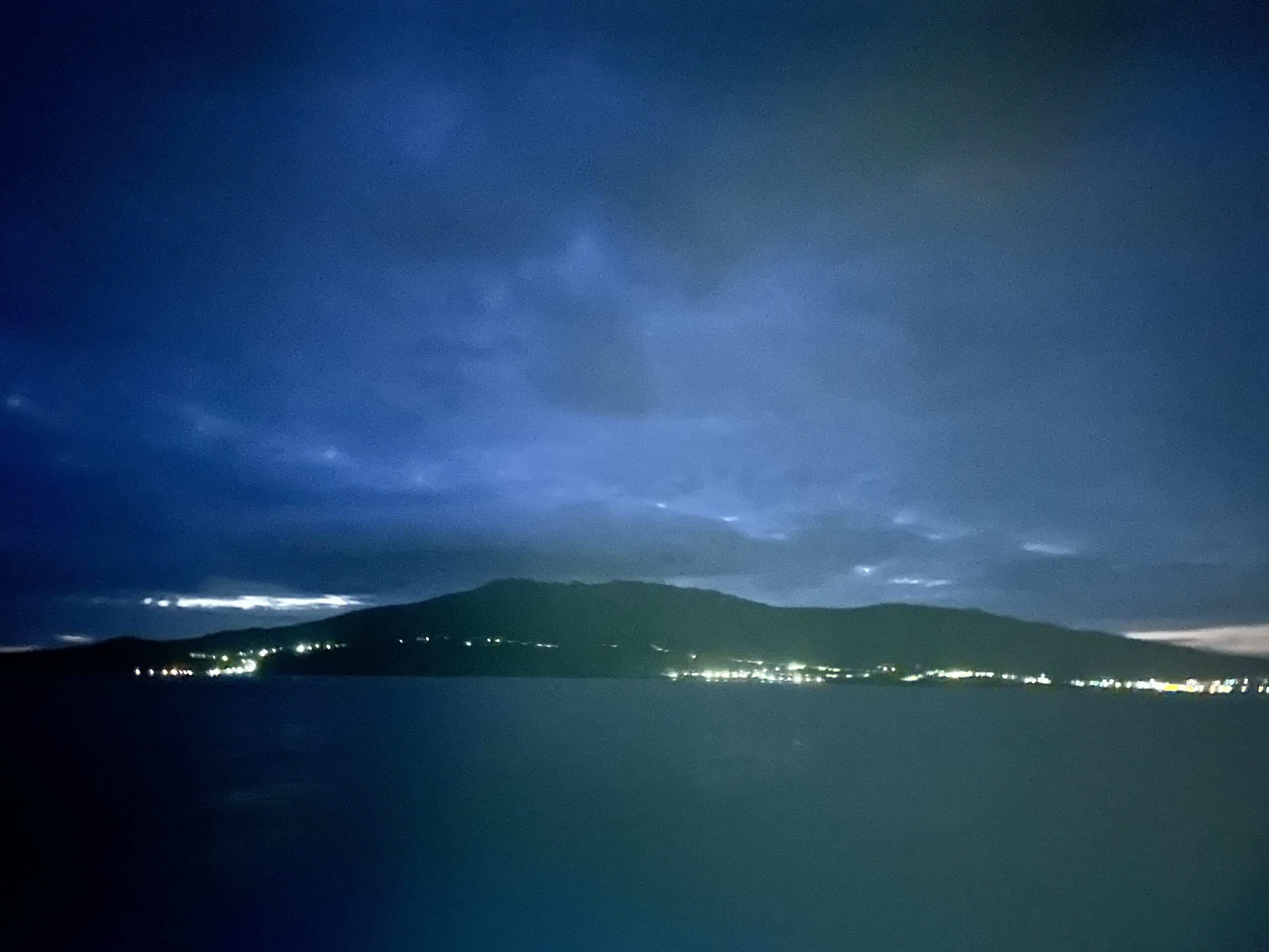 朝、4時頃。まだまだ暗い中、三宅島が見えてきました🙌 着岸は朝5時!