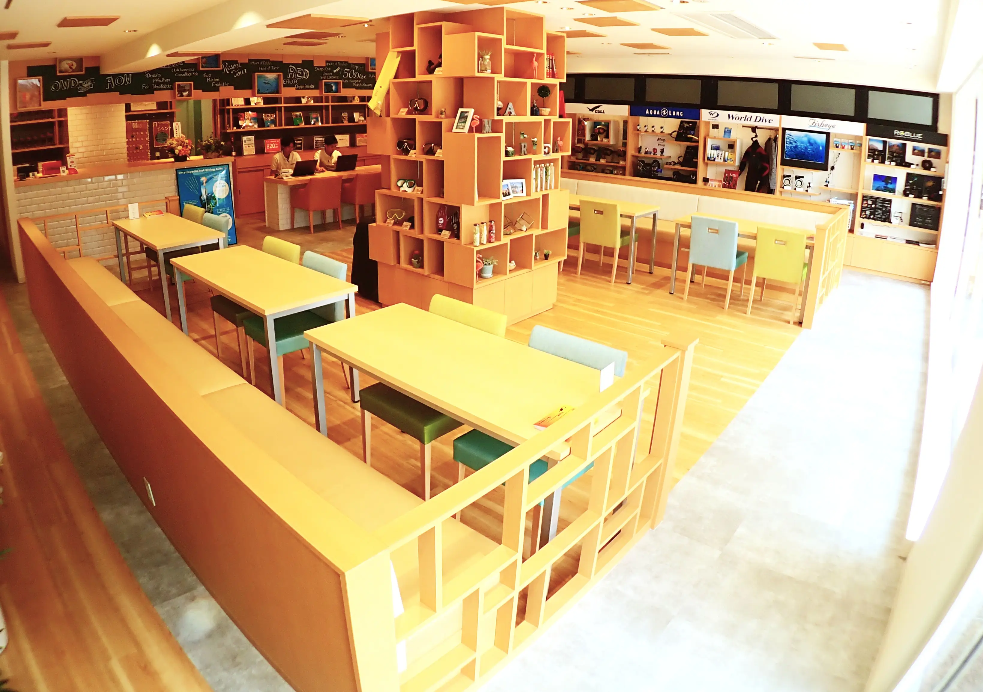店内には椅子席だけでなくソファ席も完備しており、外観からカフェと間違われるほどリラックスできる雰囲気が特徴です。ダイビングはストレスを減らすことで快適性が向上するスポーツ。当スクールでは、学科講習も快適な空間で行えるよう工夫し、リラックスしながら学べる環境を整えています。快適な空間で、楽しくダイビングを始めてみませんか?