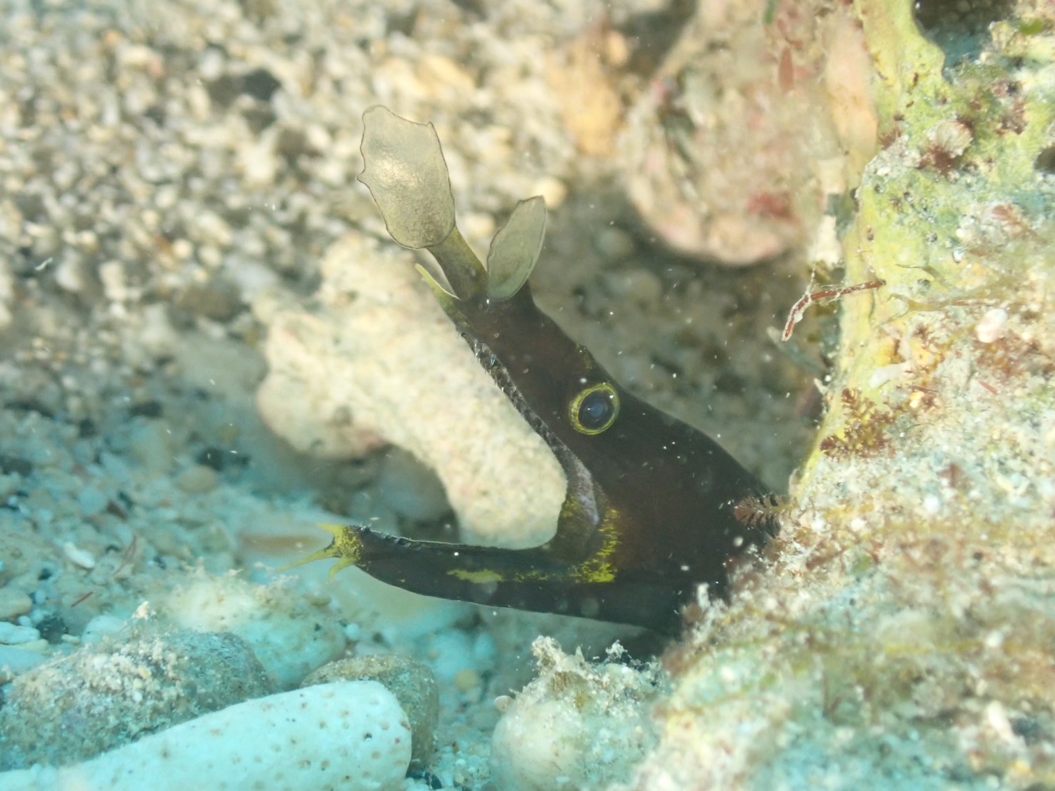 早速、ハナヒゲウツボの幼魚がお出迎え!!なかなか観察することが出来ない個体だけに、テンションが上がります!