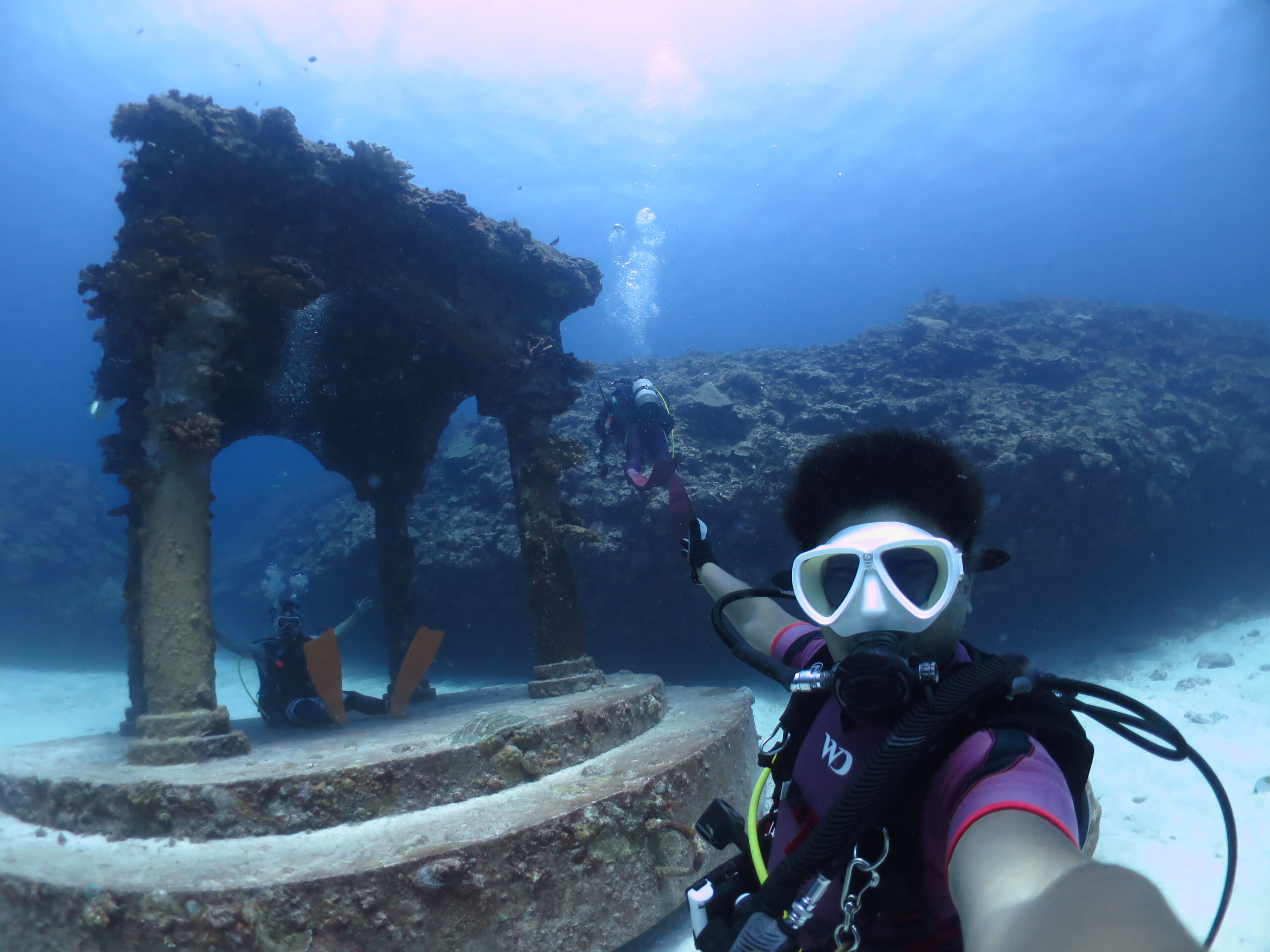 冬の水温が低い時期はフードをかぶってダイビングしますが、春から秋は何も被らないでダイビングする方が多いです!