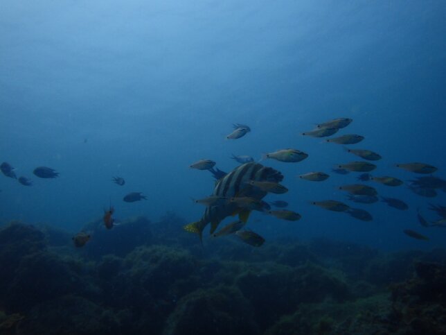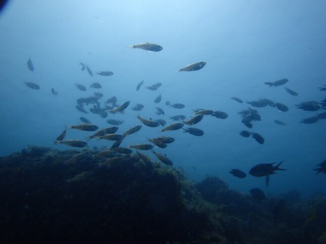浅場でも生物がたくさんいて、アジやスズメダイの群れ