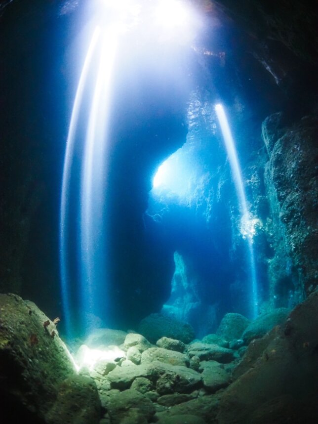光のカーテンが差し込む時間帯に潜ると、幻想的な水中景観を楽しめます。