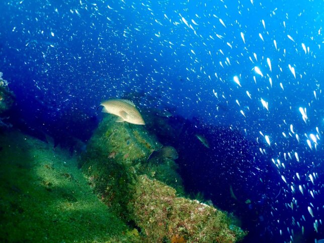 日本海特有の冬に荒れる海が長い歴史で、鳥取田後の水中にダイナミックで複雑な地形世界を作りあげました。神秘的な洞窟ダイビングが田後では見えます!そして季節によって見える生物が物凄くはっきりしているので、多種多様な生物も観察できます。流れも無く深度も浅いので、初心者の方も楽しめるポイントになっています!