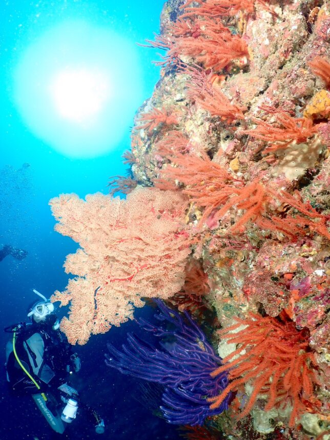 夏(6〜9月):穏やかな日が多くなり透視度20M以上見れる日が増えてきて、ウェットスーツで気持ちよく地形ダイビングができます✨