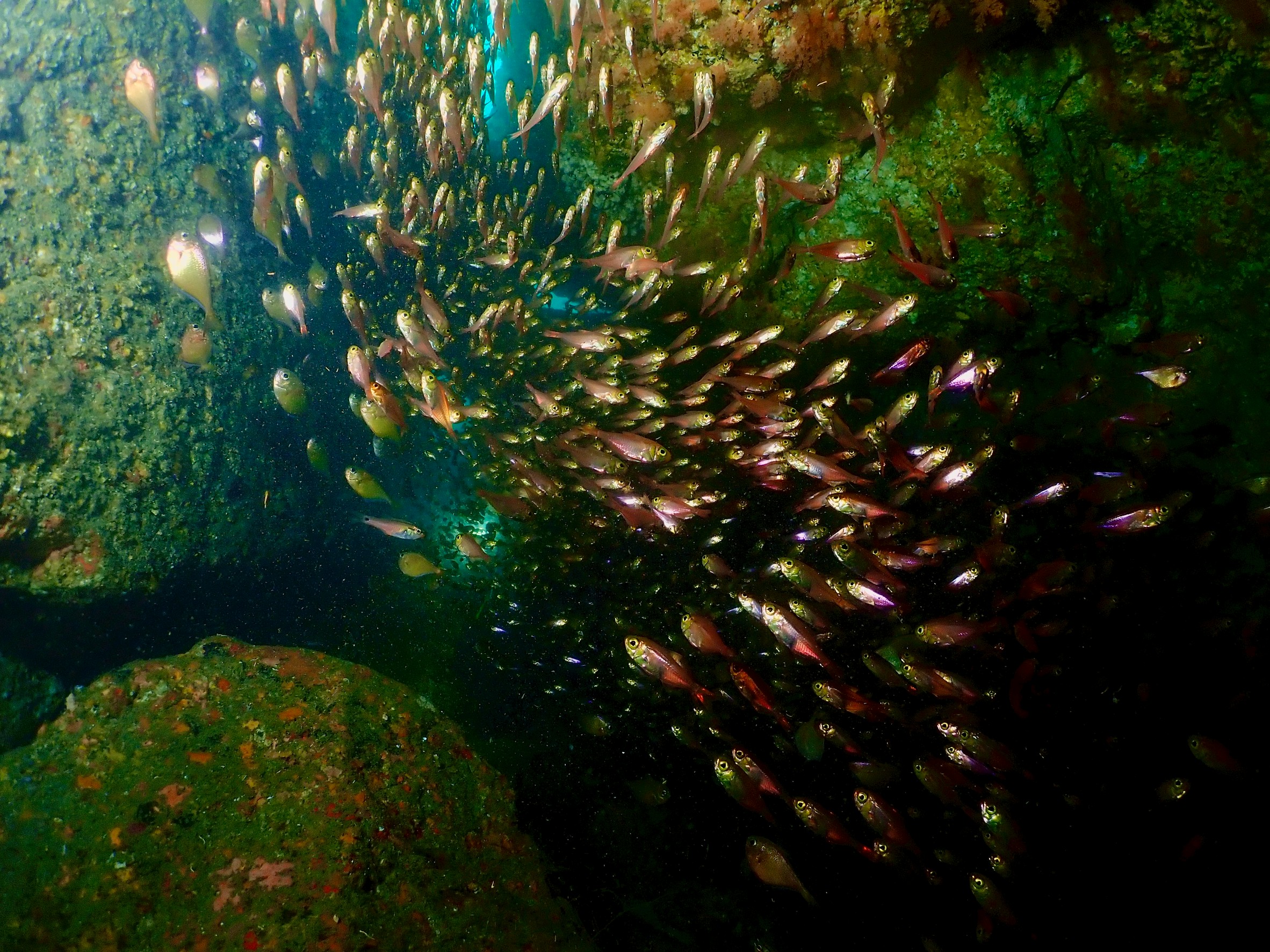 夏(6〜8月):ネンブツダイやスズメダイ、キンギョハナダイが群れで現れ、水中が一気に華やかになります!水温も高く快適に潜れますよ!