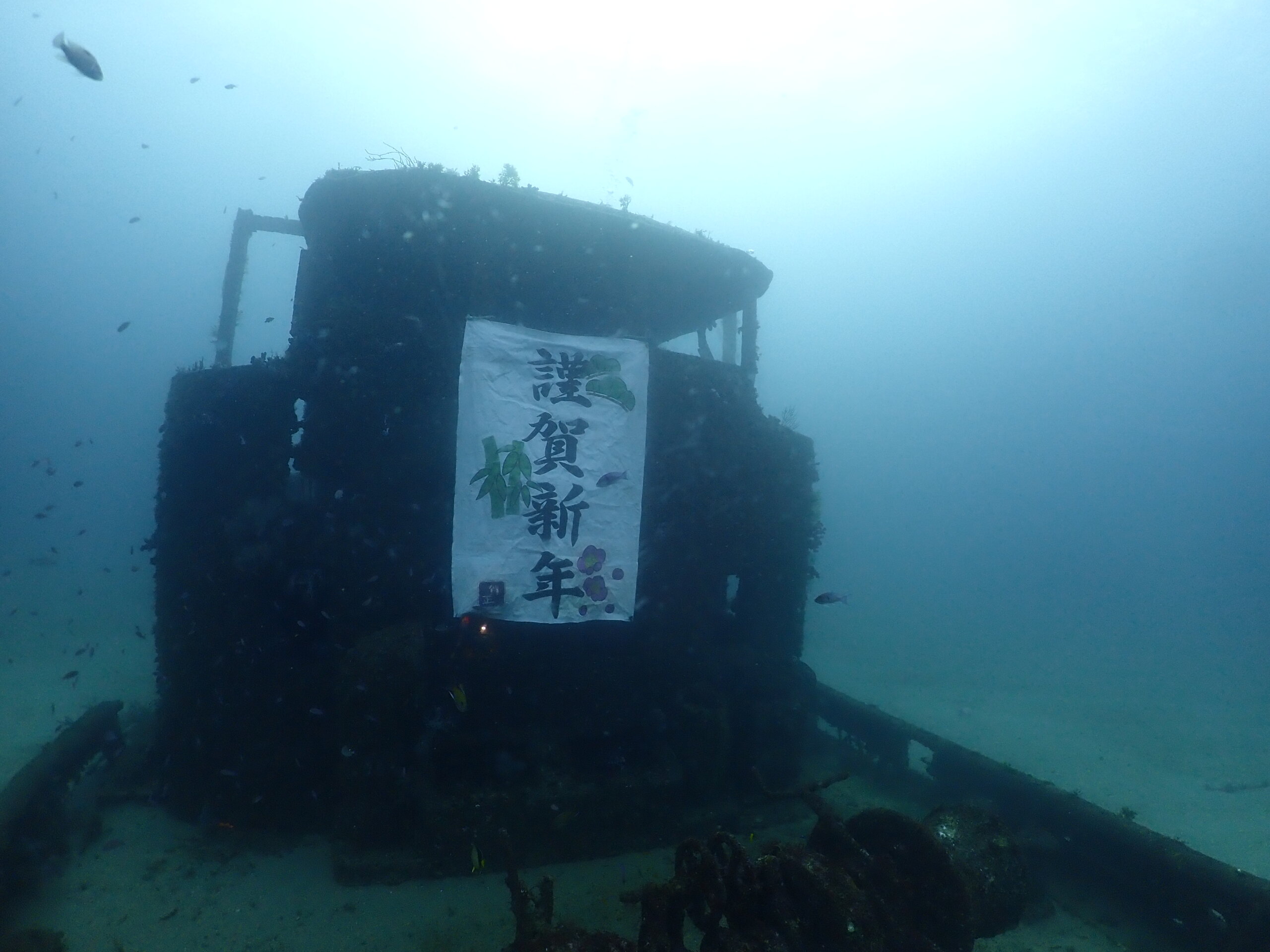 白浜には沈没船があって、年明けにはこんな垂れ幕が!!