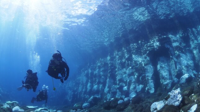 人工物かと見紛うほど規則正しく並んだ岩壁が、水深数メートルから海底へと続く様子は、まるで沈んだ神殿のようです。