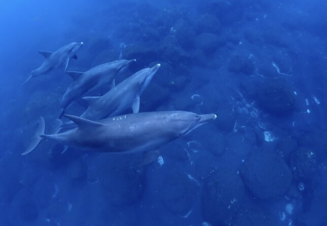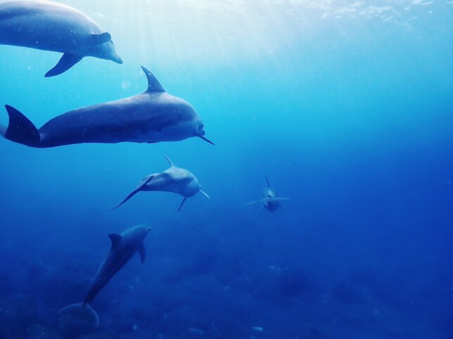 「イルカがいたぞ!」という船長の合図とともに、ウェットスーツに身を包んだ私たちが静かに海へと滑り込みます。水中に潜り、泡が消えたその先に広がるのは、自由に、そして気高く泳ぐイルカたちの姿。
