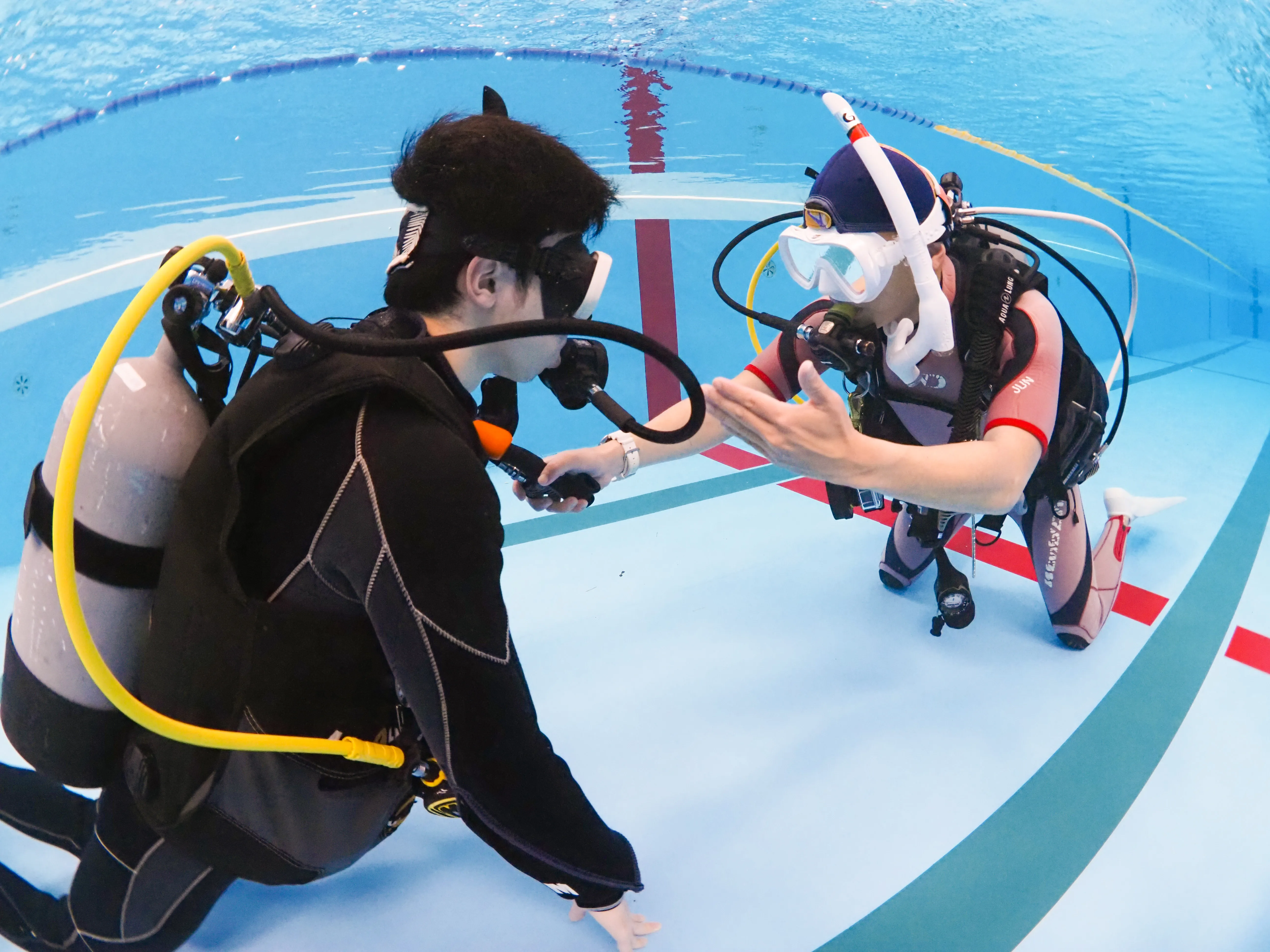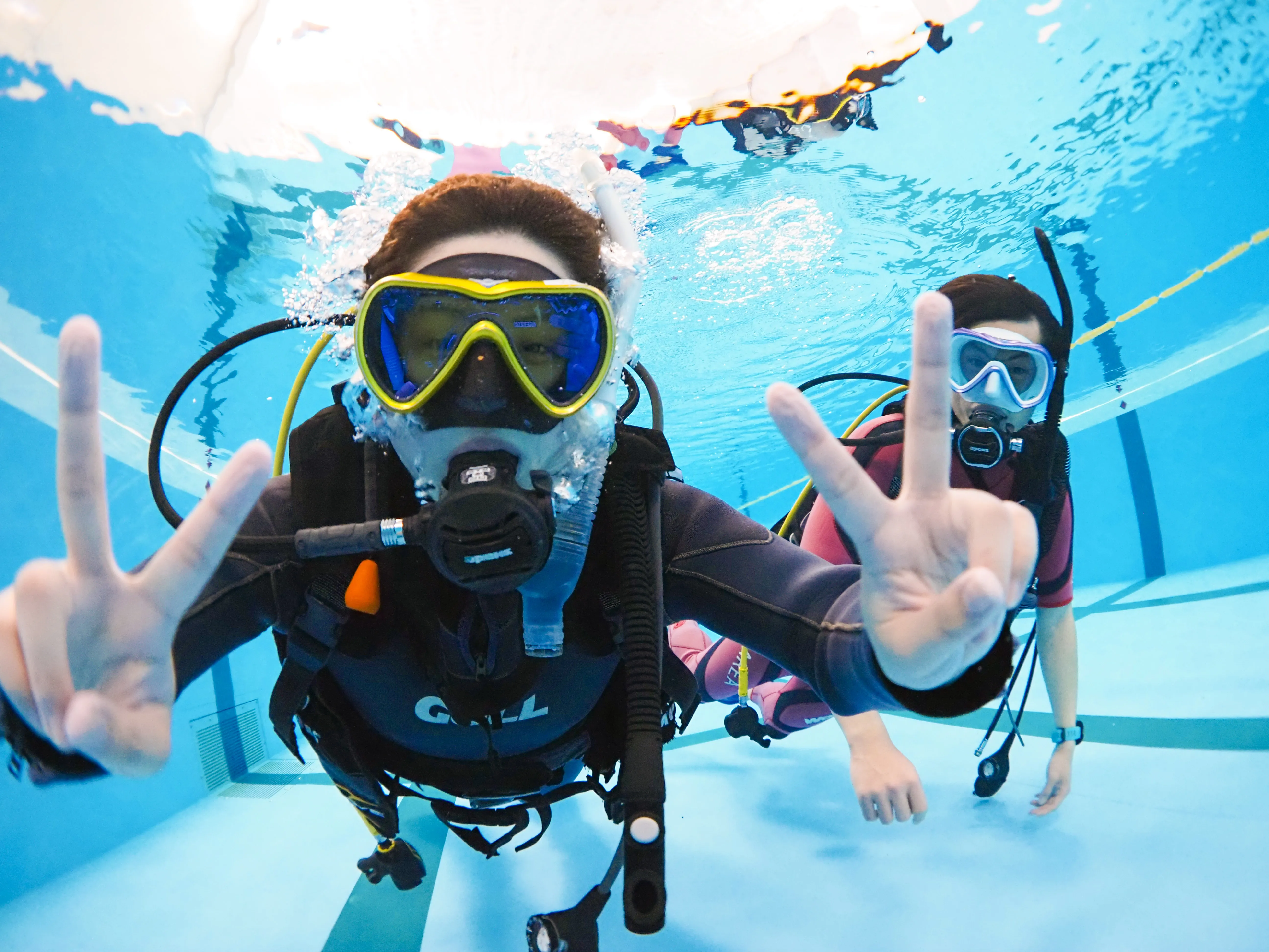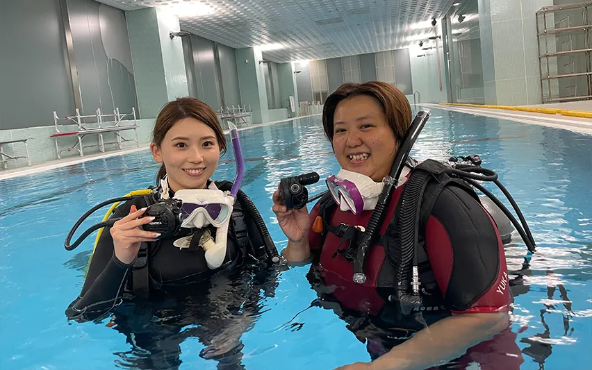 自社の大型ダイビングスクールでじっくり感覚をつかんでいきます。追加講習も無料なので、心配な方は納得いくまで練習することができます。