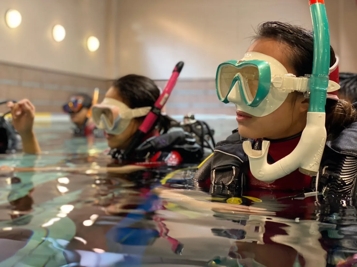 自社の大型ダイビングスクールでじっくり感覚をつかんでいきます。追加講習も無料なので、心配な方は納得いくまで練習することができます。