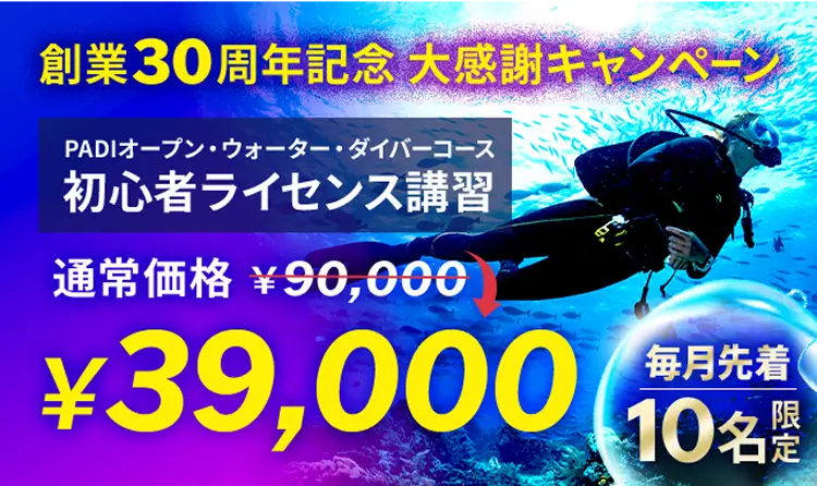当キャンペーンは”毎月先着10名様限定”で、開催しております。ご希望の方は是非、お早めにご来店くださいますよう、宜しくお願い致します。また、当店では多くの方にダイビングを始めていただけるよう、講習スケジュールはお客様のご都合に合わせて開催しておりますので、平日・週末・祝祭日問わず、ご希望日でご受講が可能です。※キャンペーン参加資格:18歳~59歳迄(高校生は対象外)また、コース内容をより詳しく知りたい方は「コース・料金」ページをご確認くださいませ。