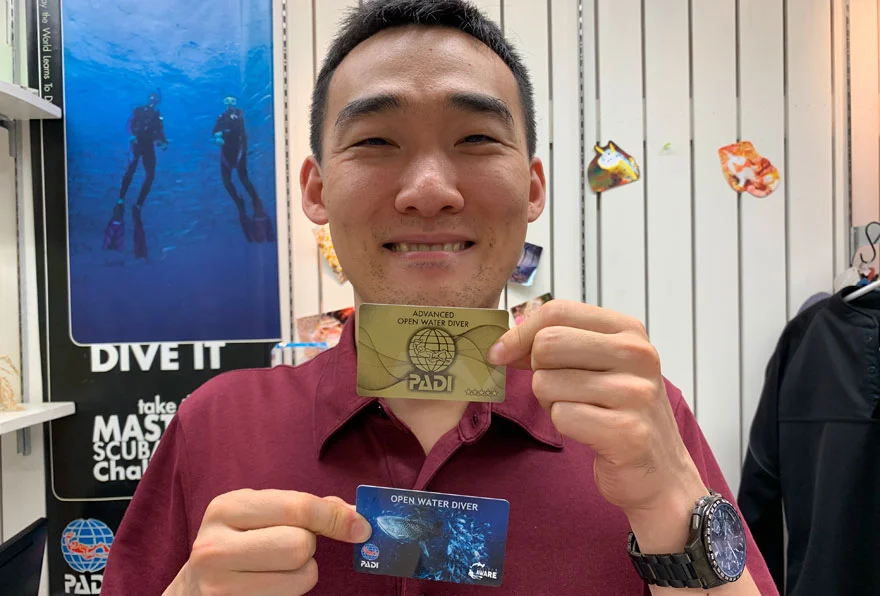 泳ぐ事自体が10年以上ぶりだったので最初はプールの深いところすらも潜れるか不安なところからのスタートでしたがインストラクターの方が丁寧に教えてくれたおかげで、AOWを取得する頃にはマスクに水が入ってきたときや耳抜き、浮力調整にも特に慌てる事なくできる様になりました。