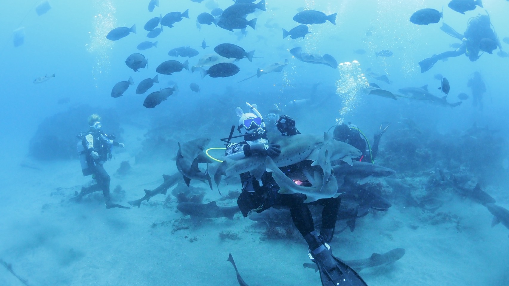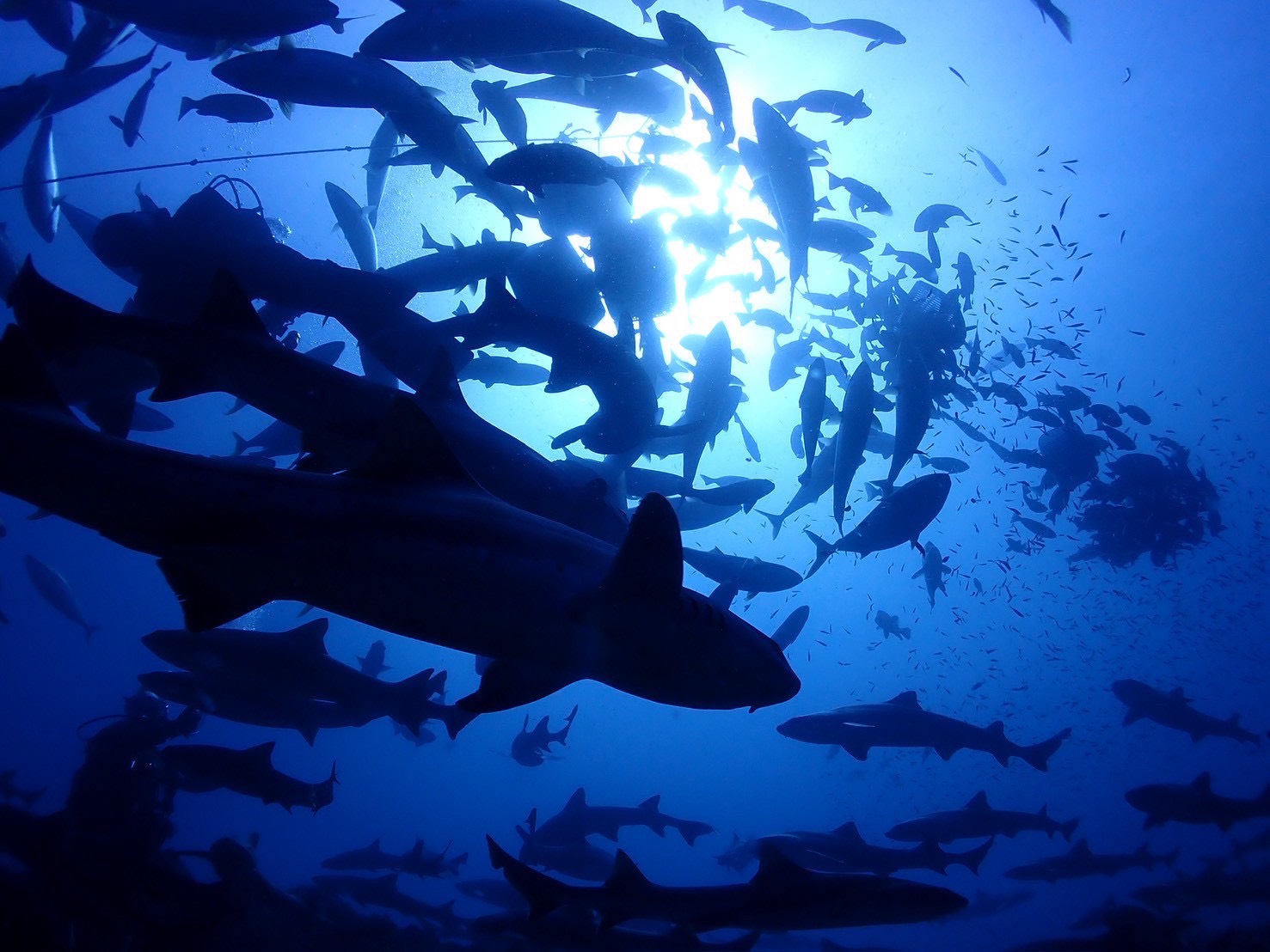 夏の太陽光が差し込む水中では、サメたちのシルエットがよりくっきりと浮かび上がり、