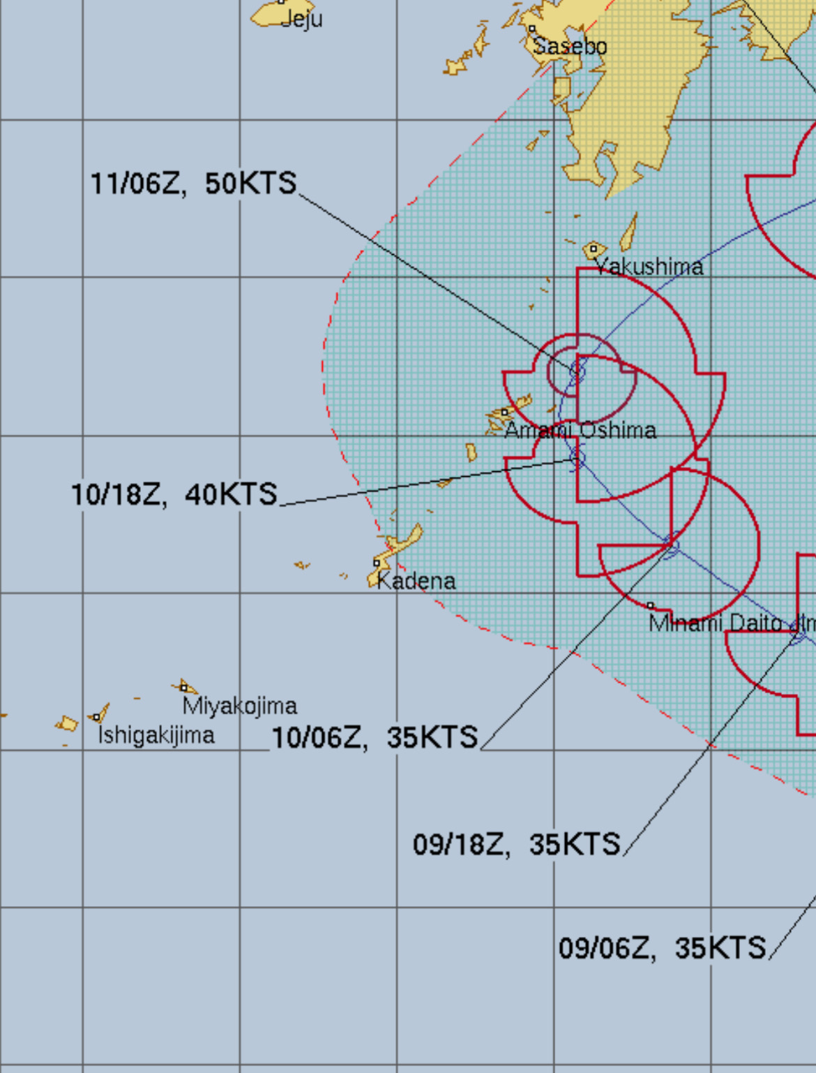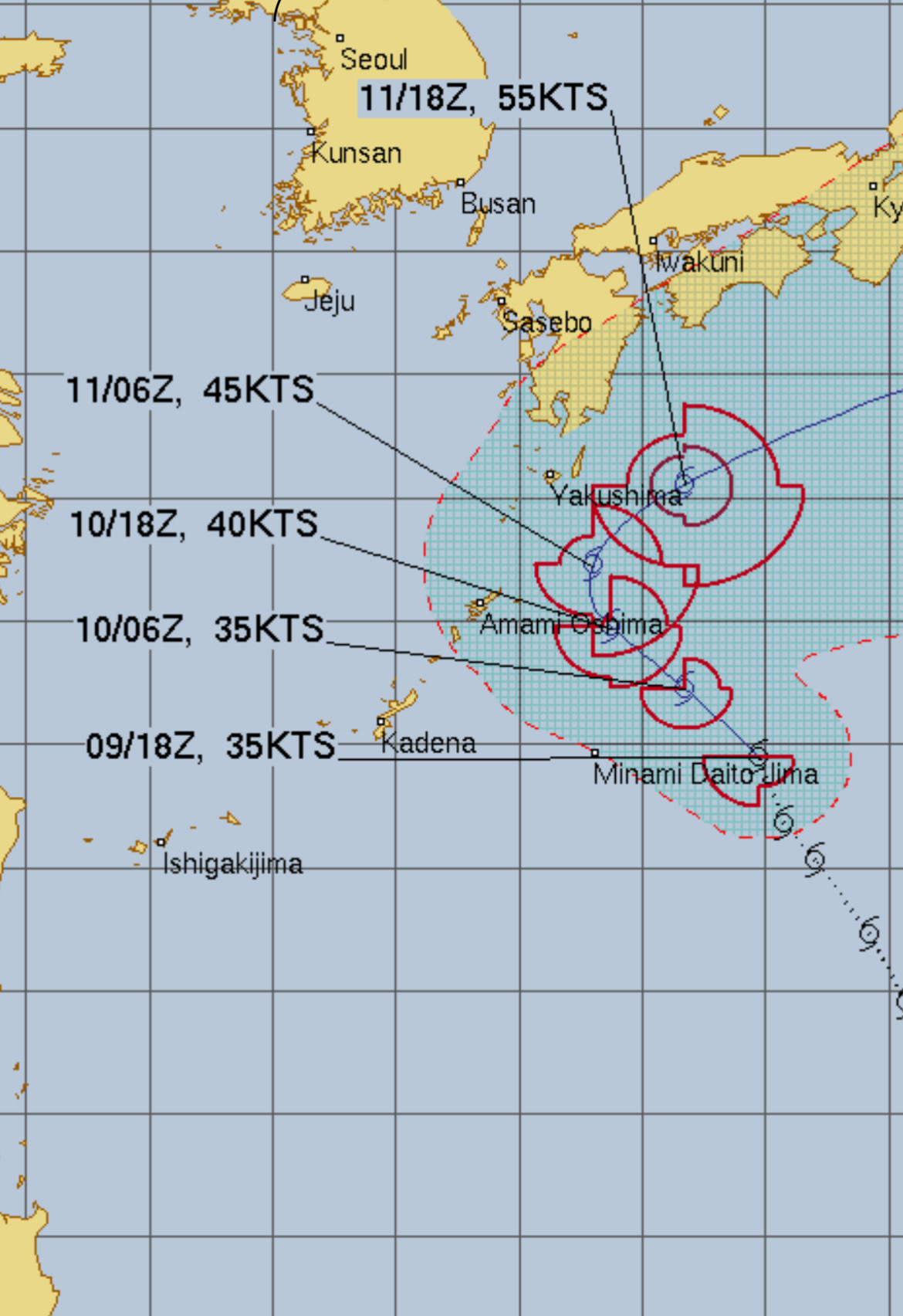 9日未明、この台風進路予報をみたときには、最悪の結末を覚悟しました・・・。