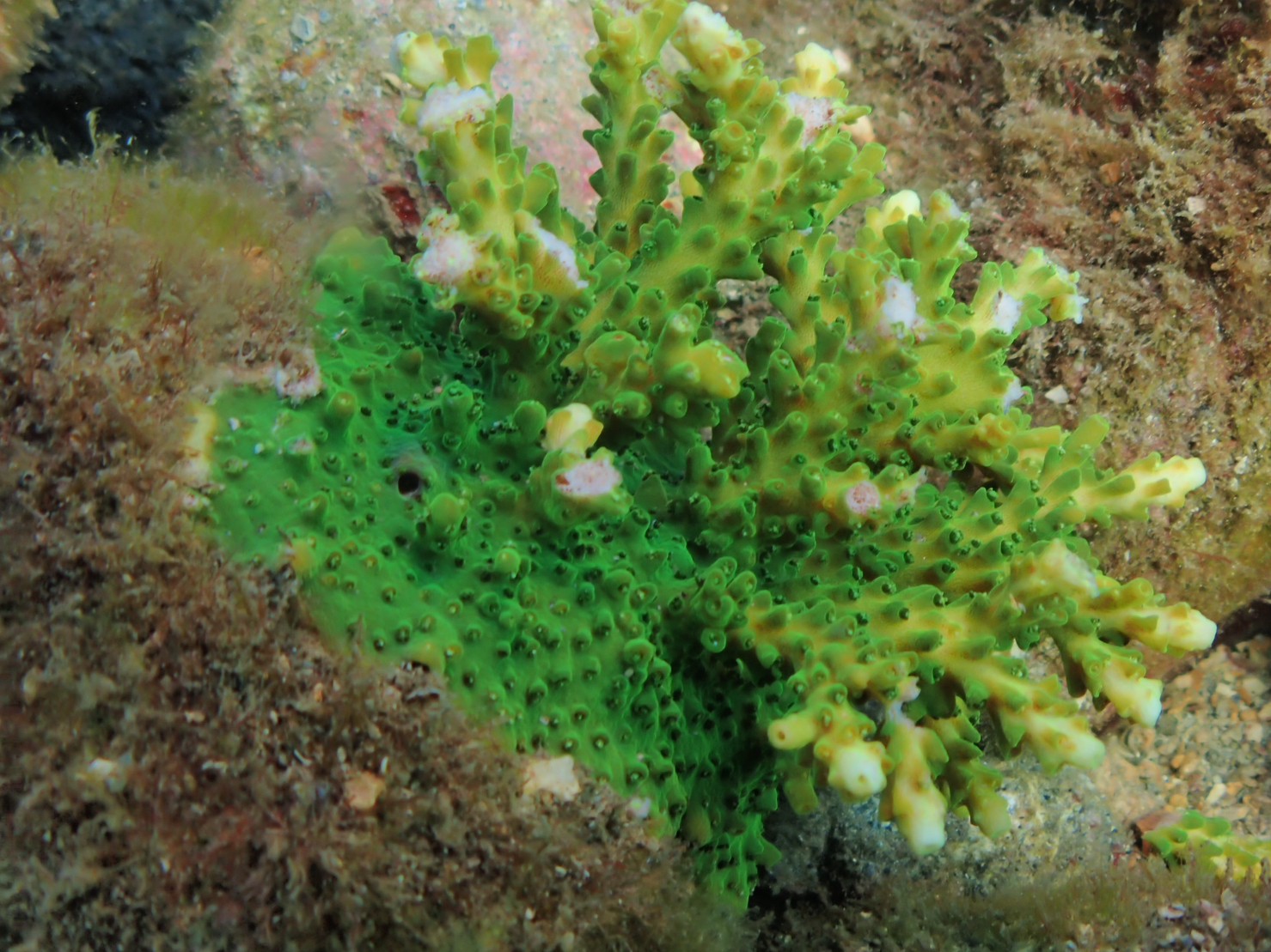 生きているサンゴは、下記の写真のように、発色の良い色を帯びているものになります。