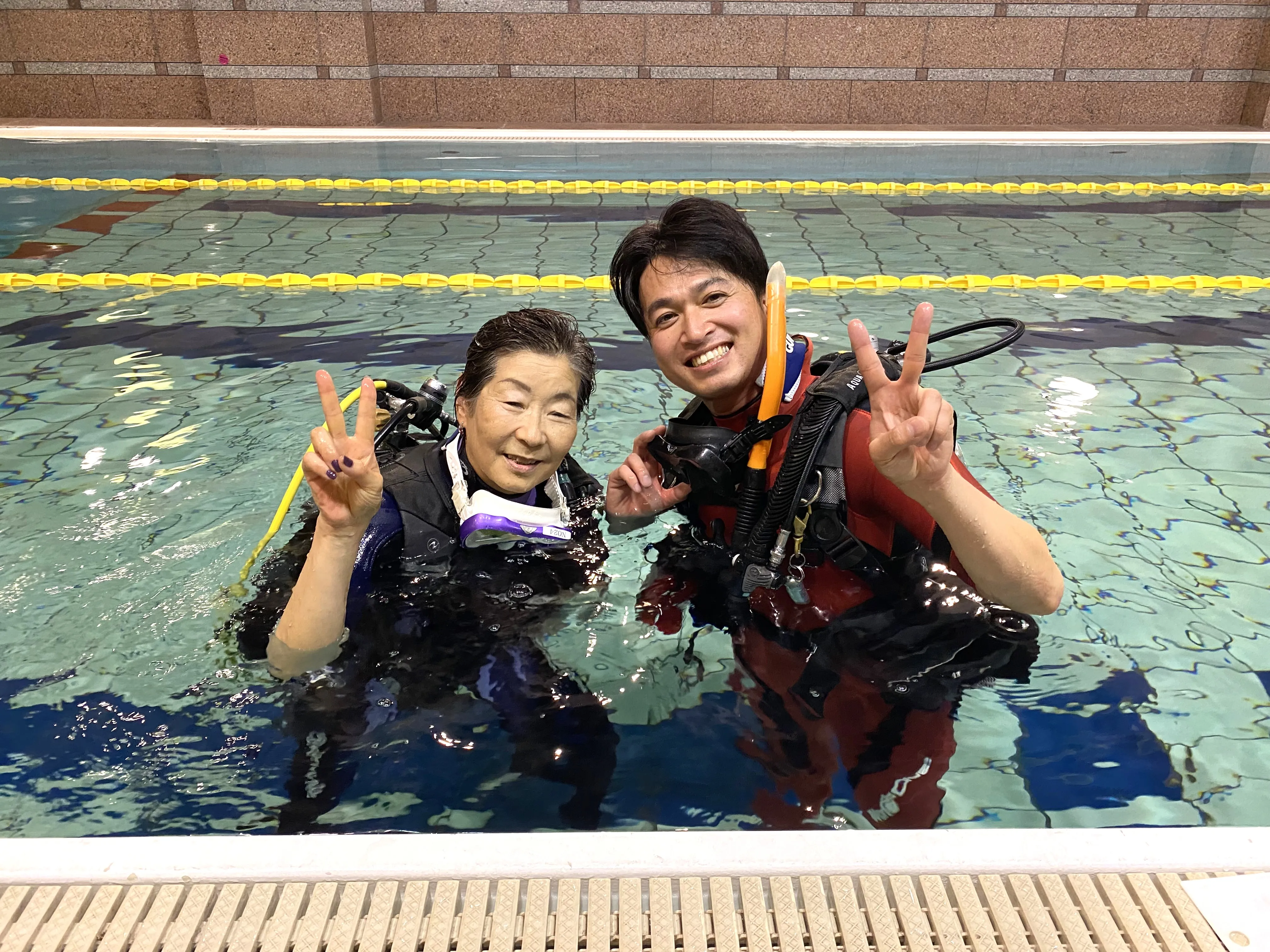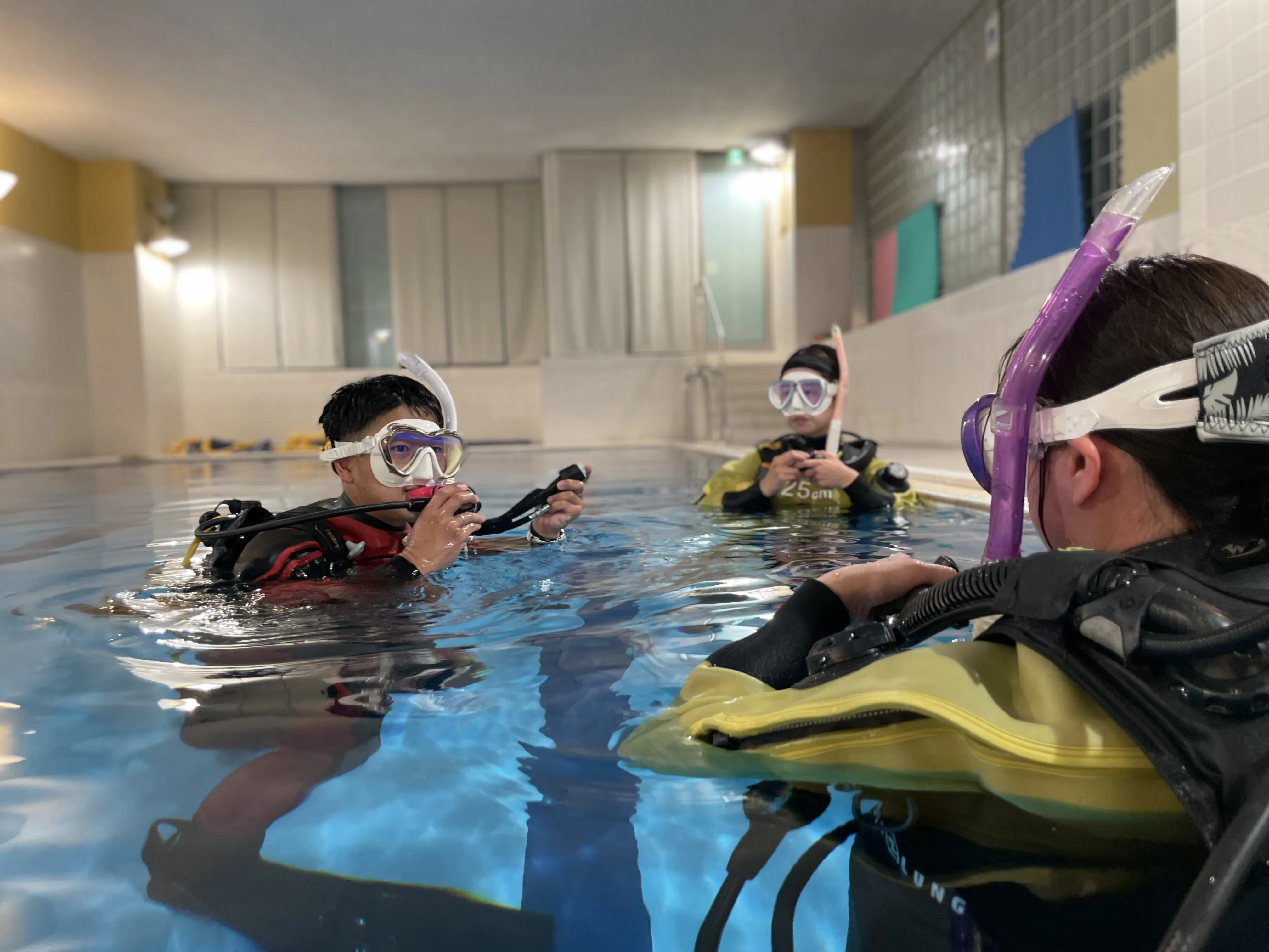 自社の大型ダイビングスクールでじっくり感覚をつかんでいきます。追加講習も無料なので、心配な方は納得いくまで練習することができます。