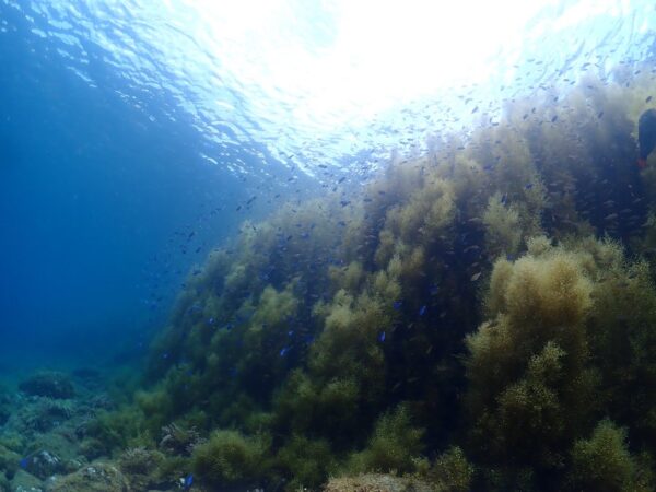 ホンダワラの群生が浅場に広がり、幻想的な海藻の森が出現します。また、ソラスズメダイやクロホシイチモチなどの幼魚が群れを成して泳いでいます!